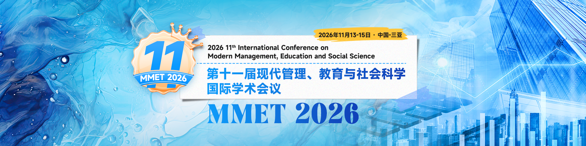 To adapt to this changing world and China's fast development in the new era, 2026 11th International Conference on Modern Management, Education and Social Sciences(MMET 2026) to be held in November 13-15, 2026. This conference takes "bringing together global wisdom in scientific innovation to promote high-quality development" as the theme and focuses on cutting-edge research fields including Modern Management and Education Technology. MMET 2025 encourages the exchange of information at the forefront of research in different fields, connects the most advanced academic resources in China and the world, transforms research results into industrial solutions, and brings together talent, technology and capital to drive development. The conference sincerely invites experts, scholars, business people and other relevant personnel from universities, scientific research institutions at home and abroad to attend and exchange!